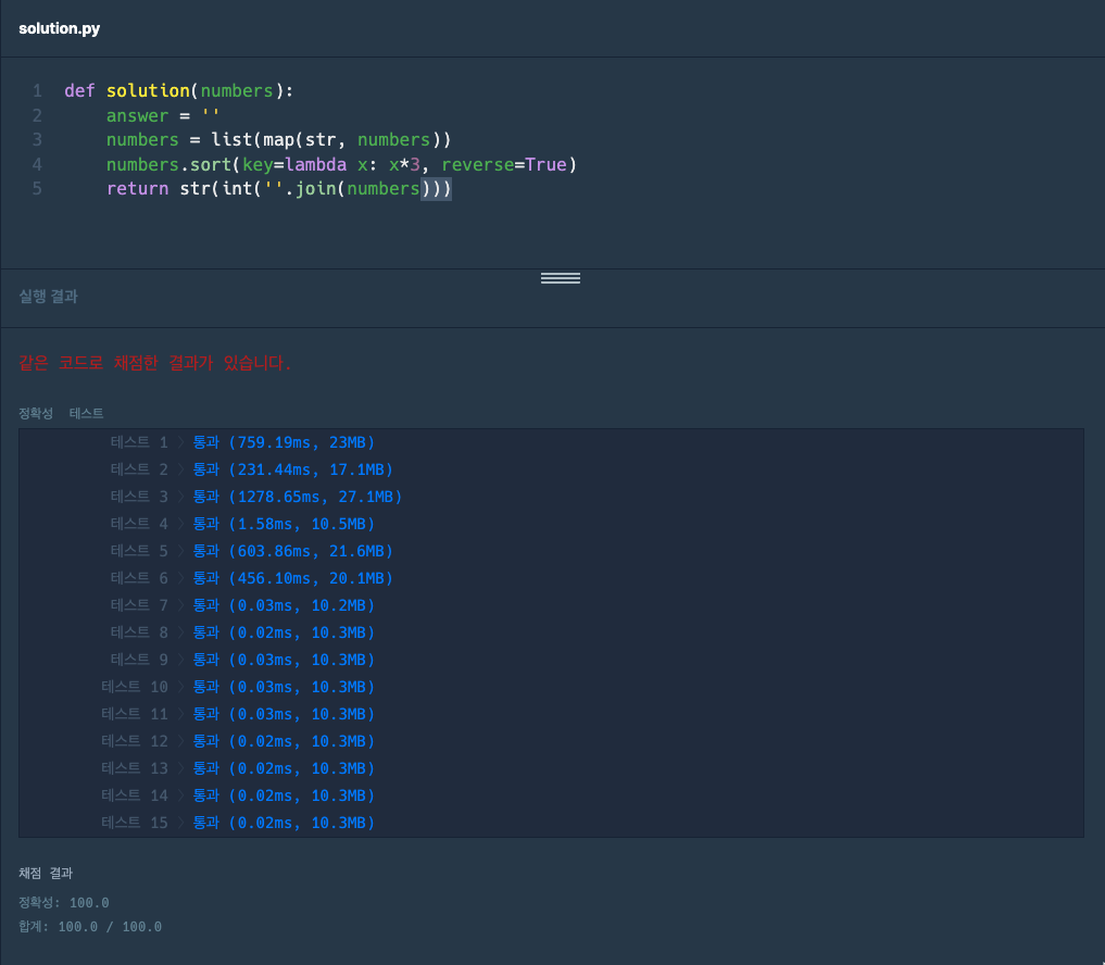 - μ μνμΌλ‘ κ°μ₯ ν° μμΌλ‘ μ λ ¬ μ [3, 30, 34, 5, 9]κ° μμ λ [3, 5, 9, 30, 34]κ° λμ΄μ κ°μ₯ ν° μ‘°ν©μ΄ λμ§ μμ