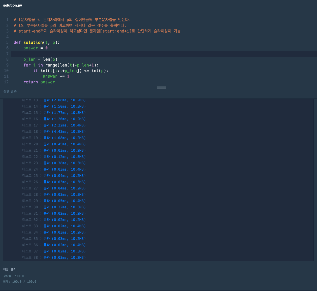- ์ซ์๋ก ์ด๋ฃจ์ด์ง ๋ฌธ์์ด t,p์ ๊ธธ์ด๊ฐ ๊ฐ์ ๋ถ๋ถ ๋ฌธ์์ด ์ค์์ ๋ถ๋ถ ๋ฌธ์์ด์ด ๋ํ๋ด๋ ์๊ฐ p๊ฐ ๋ํ๋ด๋ ์๋ณด๋ค ์๊ฑฐ๋ ๊ฐ์ ๊ฒ์ด ๋์ค๋ ํ์๋ฅผ return