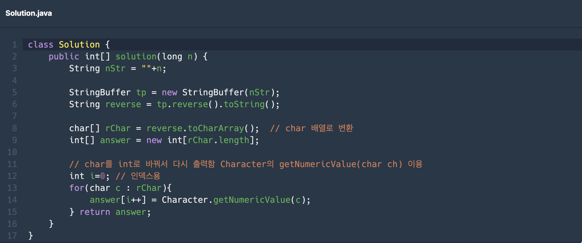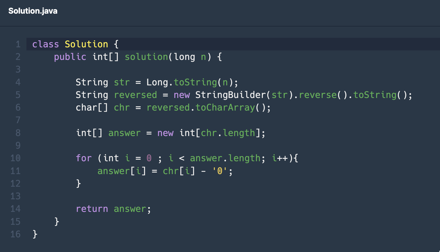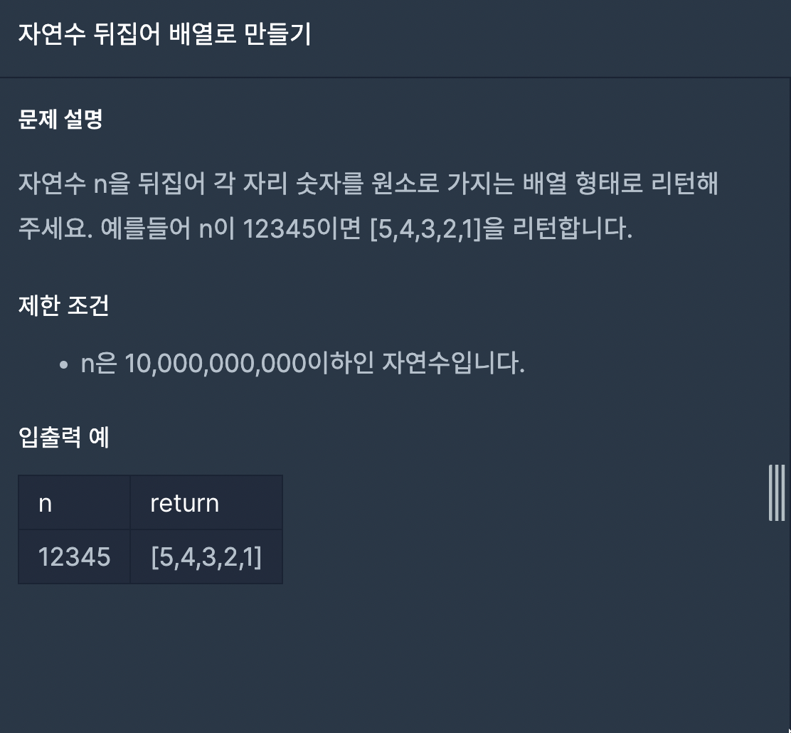 ์์ฐ์ n์ ๋ค์ง์ด ๊ฐ ์๋ฆฌ ์ซ์๋ฅผ ์์๋ก ๊ฐ์ง๋ ๋ฐฐ์ด ํํ๋ก ๋ฆฌํดํด์ฃผ์ธ์. ์๋ฅผ๋ค์ด n์ด 12345์ด๋ฉด [5,4,3,2,1]์ ๋ฆฌํดํฉ๋๋ค.