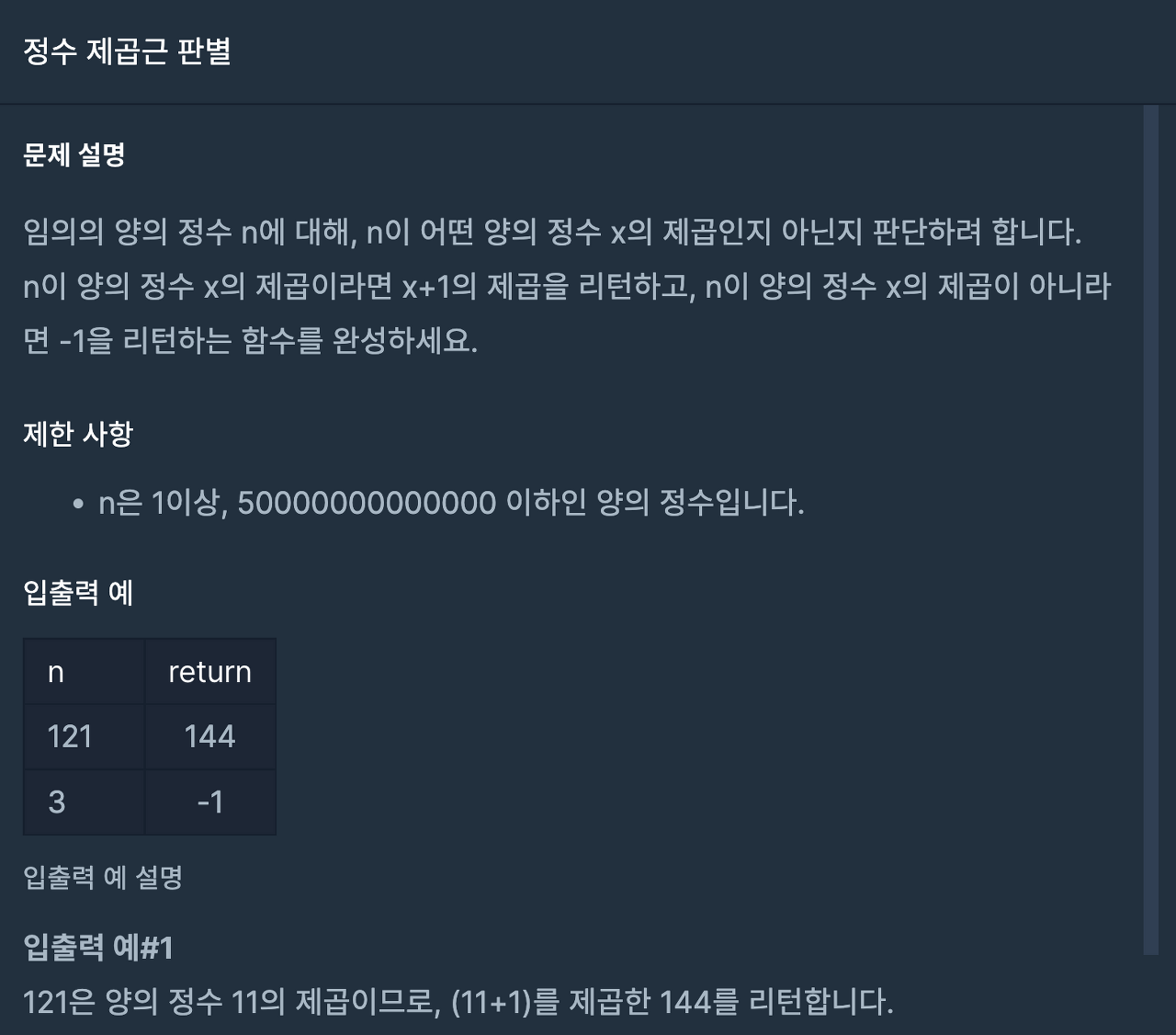 - ์์์ ์ ์ n์ ๋ํด, ์์ ์ ์ x์ ์ ๊ณฑ์ธ์ง ์๋์ง ํ๋จํ์ฌ n์ด x์ ์ ๊ณฑ์ด๋ผ๋ฉด x+1์ ๋ฆฌํดํ๊ณ , ์๋๋ผ๋ฉด -1์ ๋ฆฌํดํ๋ค.