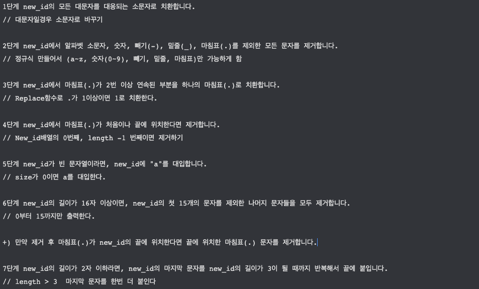 // 7๋จ๊ณ๋ new_id์ ๊ธธ์ด๊ฐ 2์ ์ดํ๋ฉด, ๊ธธ์ด๊ฐ 3์๊ฐ ๋ ๋๊น์ง ๋ฐ๋ณตํด์ ๋์ ๋ถํ๋ค.