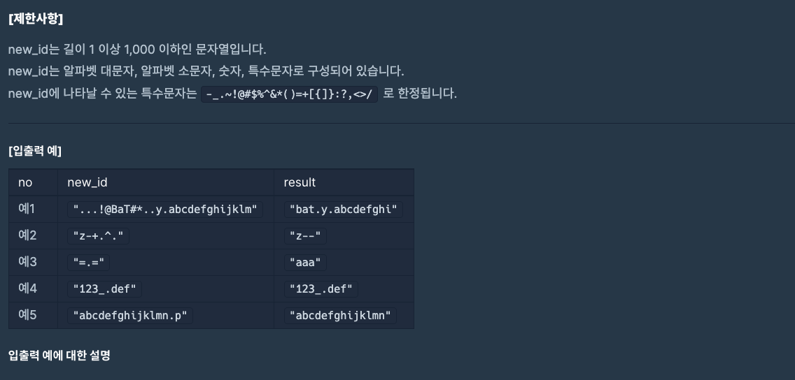 // 1๋จ๊ณ๋ new_id์ ๋ชจ๋ ๋๋ฌธ์๋ฅผ ๋์๋๋ ์๋ฌธ์๋ก ์นํํ๋ค.