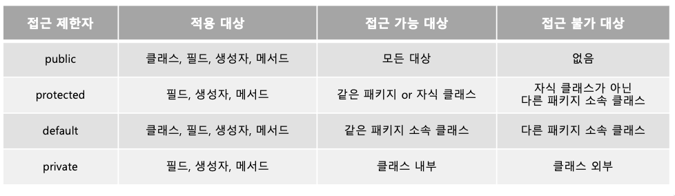 - Java에는 4가지 접근제한자가 있으며 ( private > default > protected > public ) 순으로 보다 많은 접근을 허용