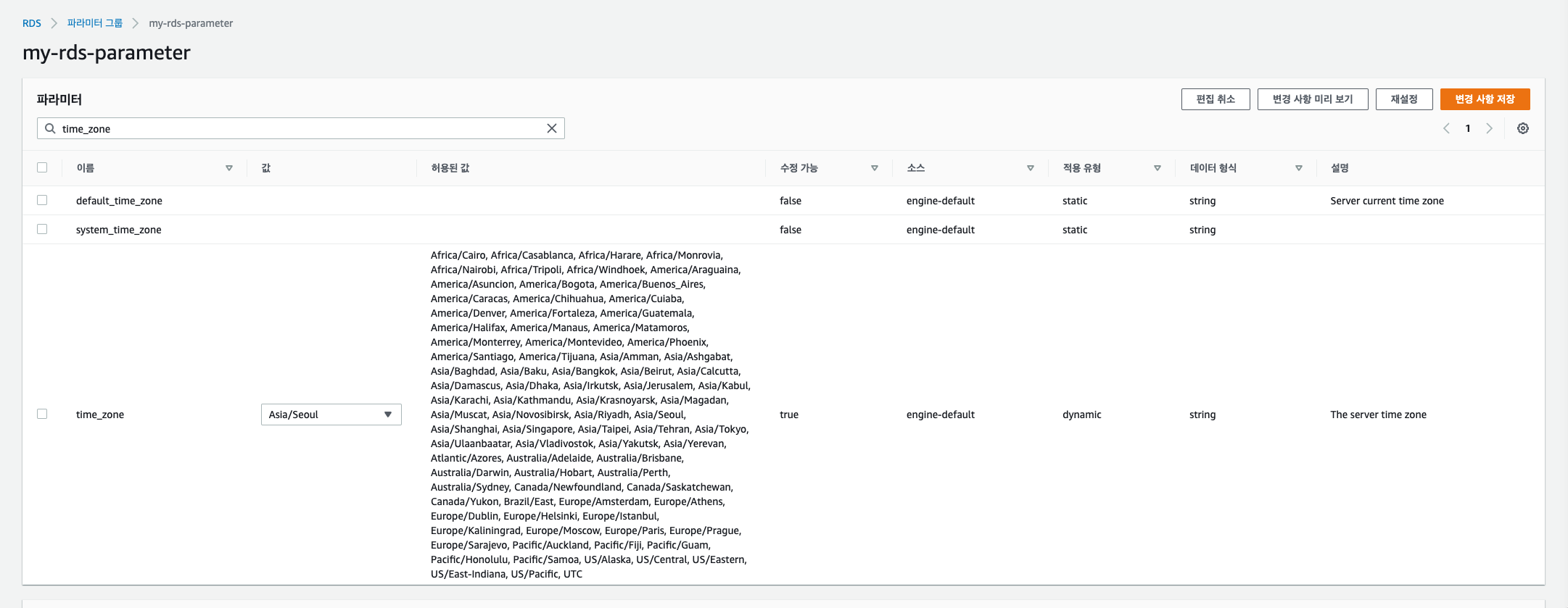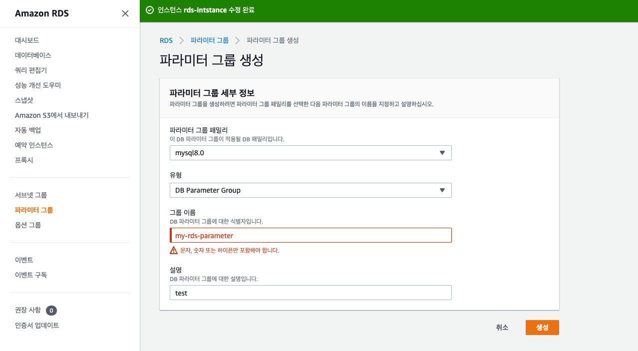 RDS > ํ๋ผ๋ฏธํฐ ์ค์ ๋ณ๊ฒฝ