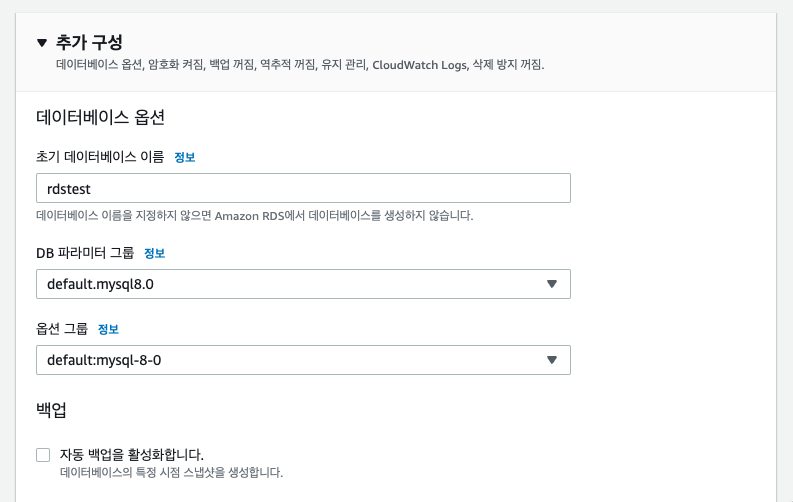 ๋ฌดํผ ์ค์ ์ ๋ค ํ๊ณ ๋์ ํ๋ผ๋ฏธํฐ ๊ทธ๋ฃน์ ์ ์ฉํ๋ ค๋ฉด RDS ์ธ์คํด์ค ์ฌ๋ถํ ์ ํด์ฃผ๋ฉด ๋๋ค.